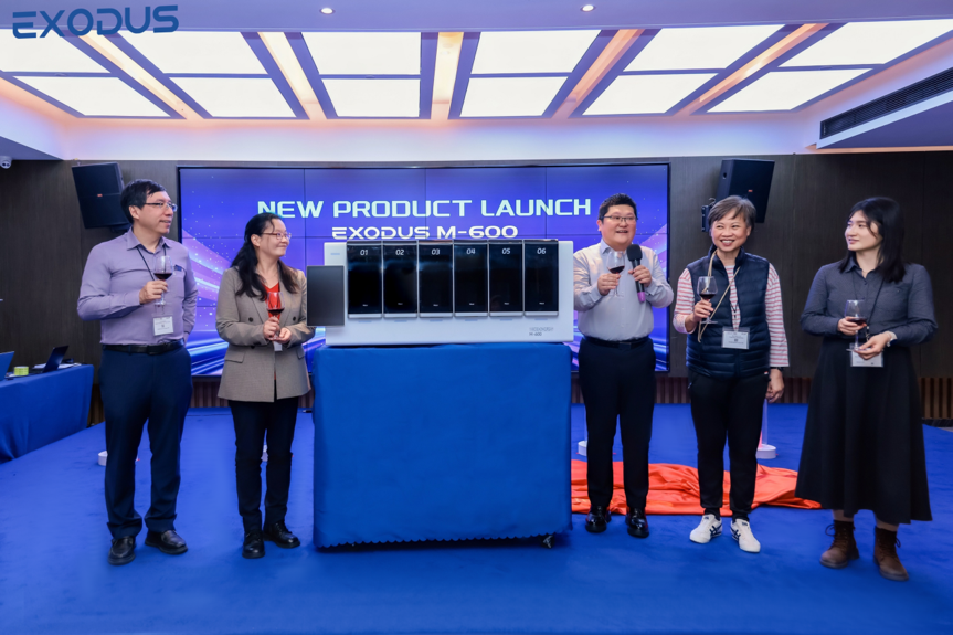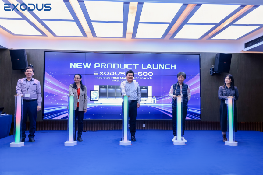 在全场嘉宾的见证下,新加坡国立大学 Sai Kiang Lim教授、台湾阳明交通大学生物制药科学研究所黄奇英教授,以及澳大利亚麦考瑞大学王玉玲教授,中山大学医学院黄依瑶副教授,与汇芯生物 CEO &联合创始人杨一杰联袂登台,按下象征创新与合作的启动键,共同完成新品发布仪式,标志着 EXODUS M-600多通道纳米粒子复合纯化系统正式面向全球发布。